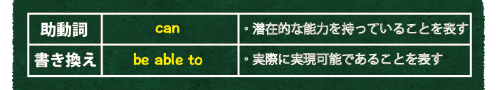 さて、最初に紹介した助動詞を使う際のルールの中に、「④助動詞の直後にほかの助動詞が続くことはない」とあります。なのでたとえば、『~できるだろう』のように、『~できる(can)』の意味と『~だろう(will)』の意味を織り交ぜて使いたい場合は、上に紹介した『一般動詞(またはbe動詞)を使った表現』を使えばこの問題は解決します。
