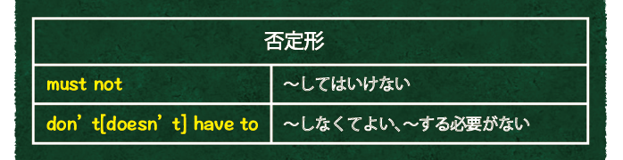 そして、最後の「 must 」と「 have to 」に関しては、否定形になったときに意味がガラッと変わりますのでお間違えのないように!! 下にそれぞれの意味を記載しておきます。